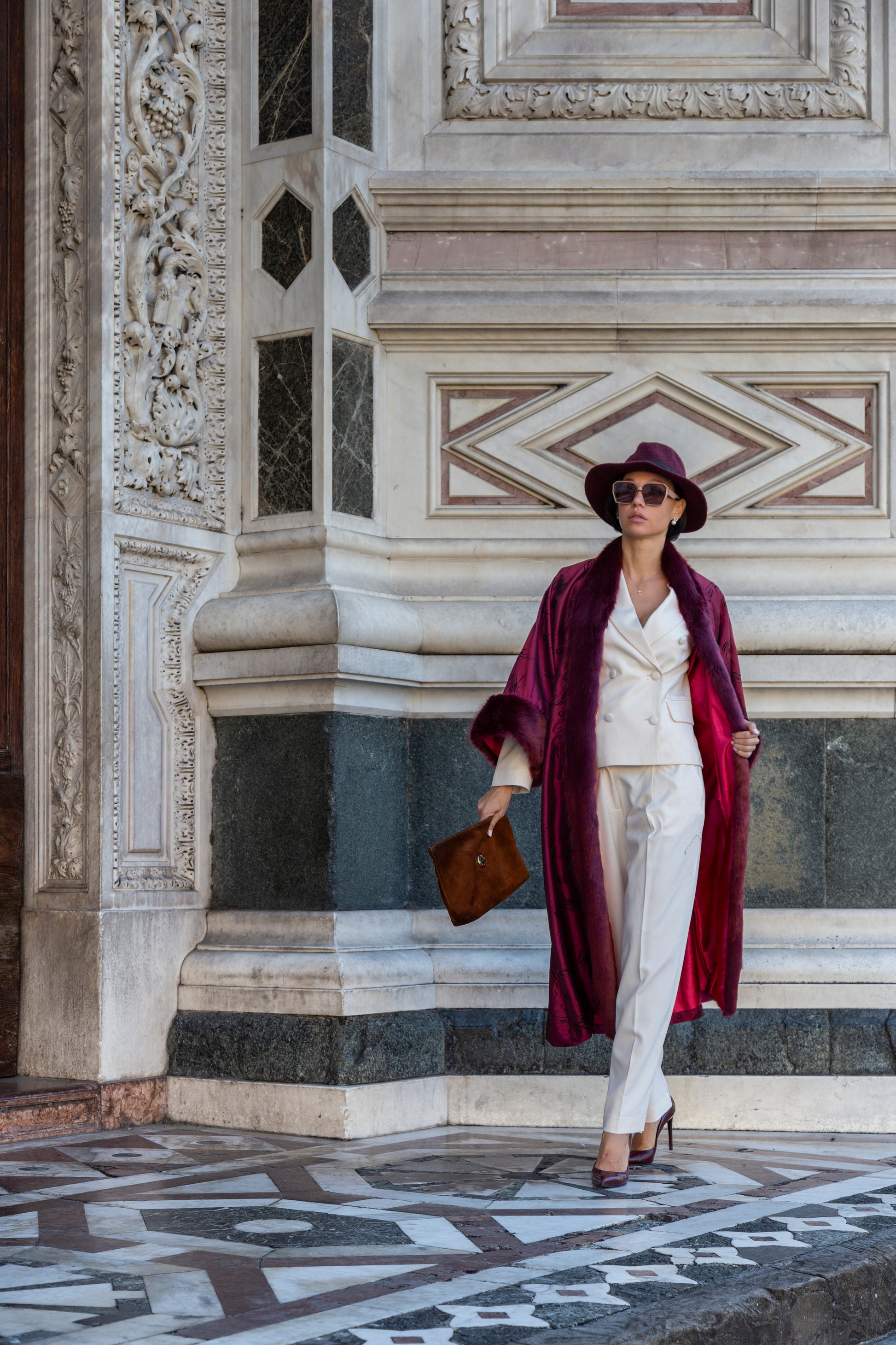 The plush faux fur trim along the collar and cuffs gives it a hint of discreet luxury, making it ideal for elegant evenings or to add a sophisticated twist to an everyday outfit.