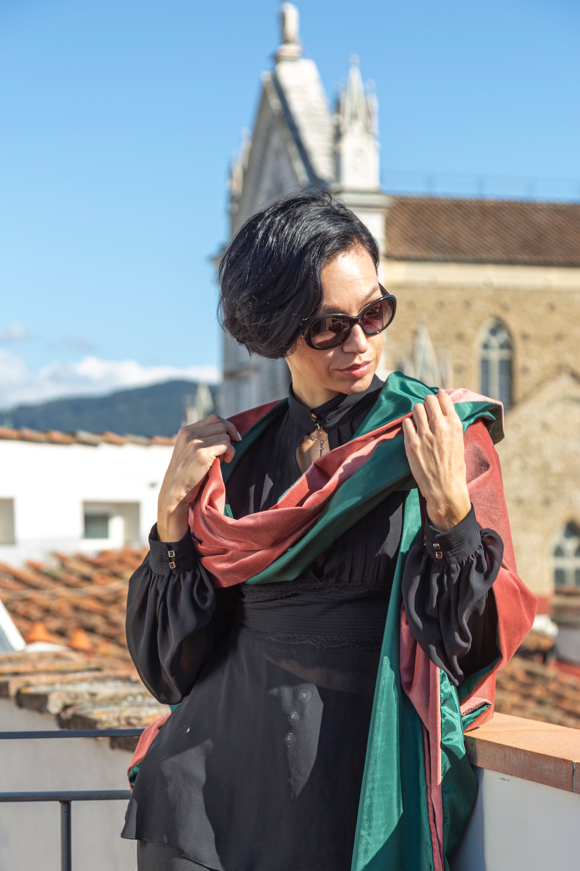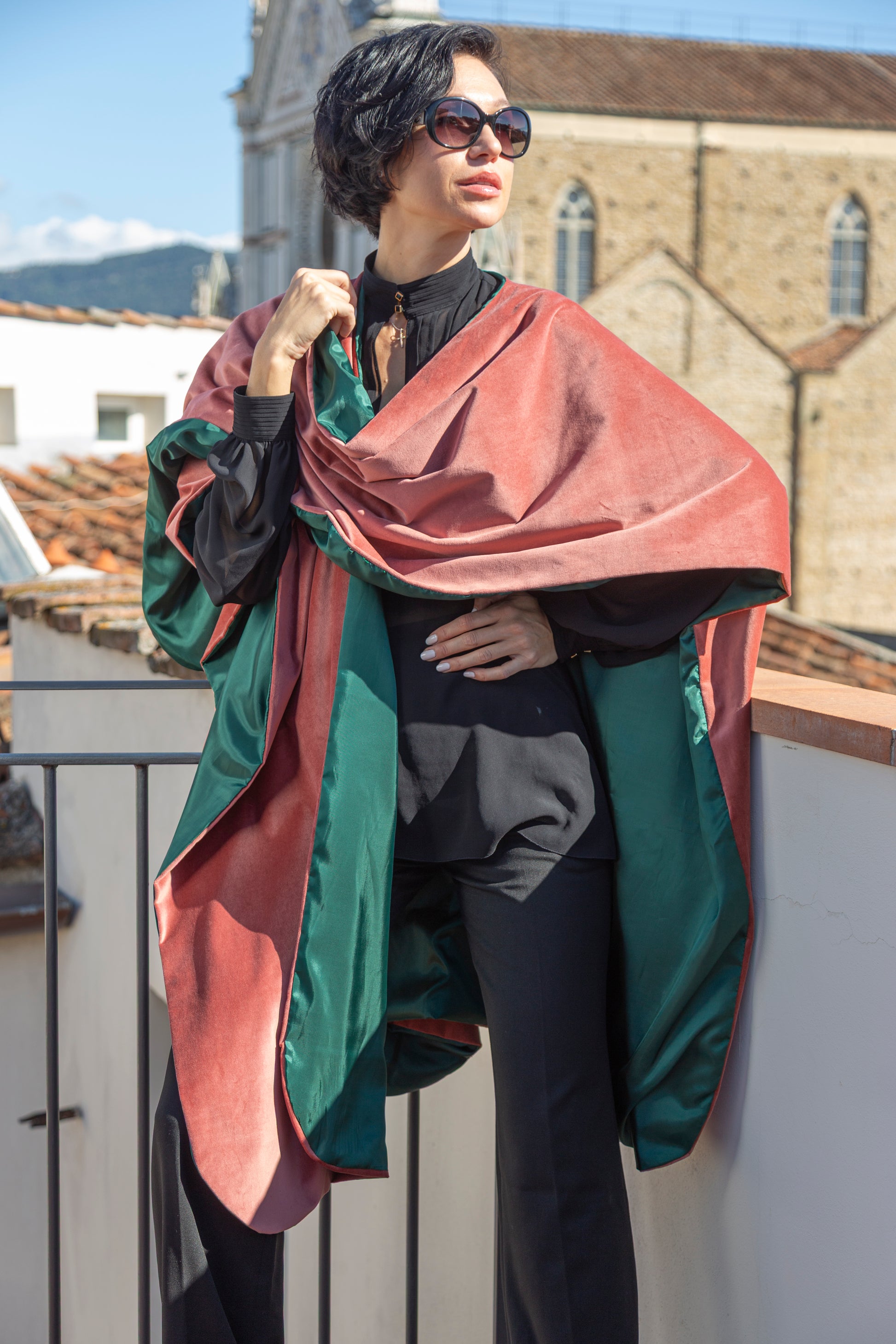 Handmade in Florence, this piece combines the soft glow of peach velvet with the luxurious depth of green, creating a harmony of warmth and elegance that instantly elevates any outfit.