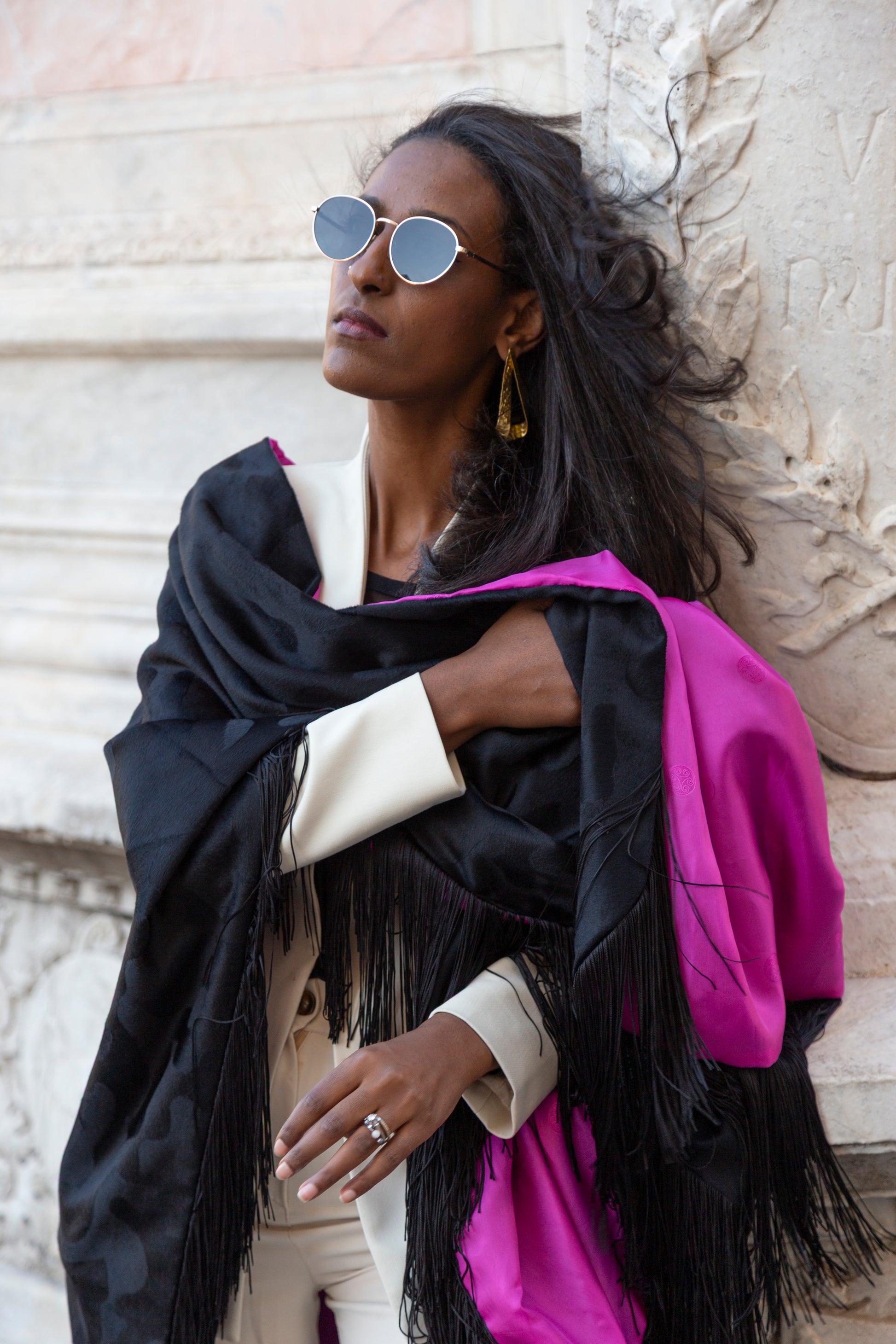 The soft, fluid lining in fuchsia adds a pop of color and comfort, making every motion graceful and eye-catching. Perfect layered over dresses, trousers, or jeans, this poncho transforms any outfit into a statement of refined style and sophistication.
